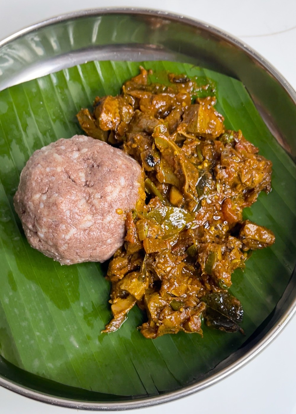 Typically ragi mudde is served with vatha kuzhambu or kara kuzhambu but you can enjoy with chicken kuzhambu or mutton curry.