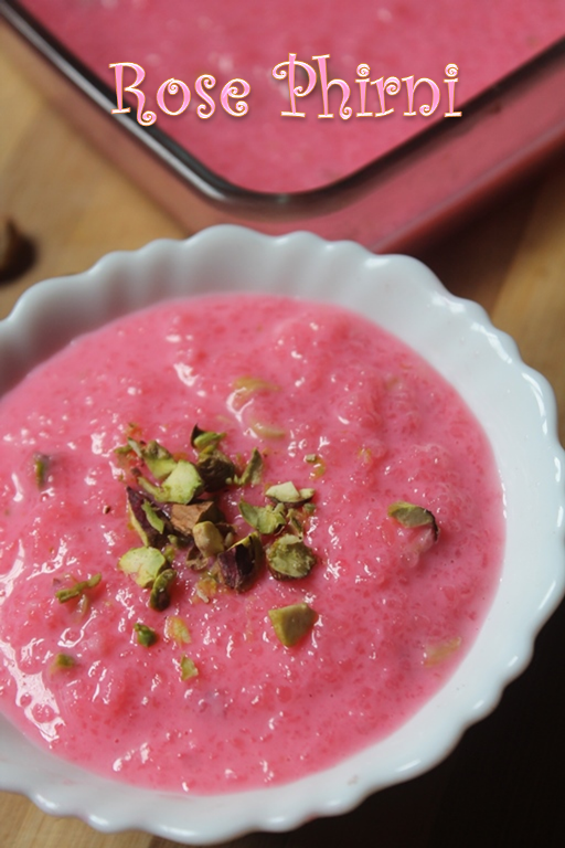 Rose Phirni Recipe with step by step pictures. Rice kheer flavoured with rose extract, cooked in milk and topped with plenty of nuts. Perfect dessert for any special occasions. This rose kheer will make any special moments even more special.