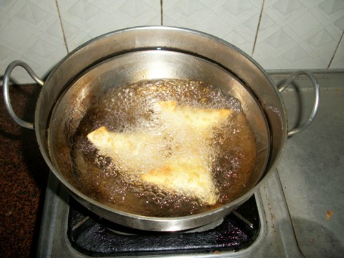 - Heat oil for deep frying and fry this samosa on medium heat for 3-5 mins until slightly cooked. Remove it and set aside.