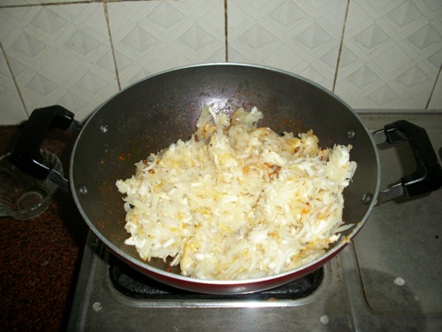 - Season with salt and mix well..Now add in cooked tapioca - potato mixture and mix well. Cook this for 5 mins. Remove and set aside to cool.
