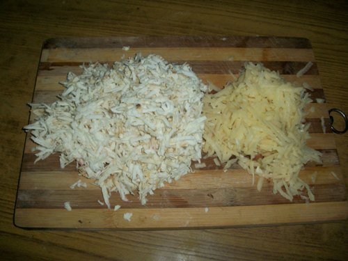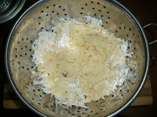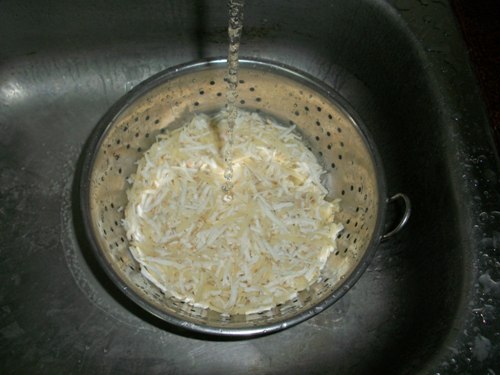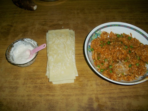 - Meanwhile make the filling for the samosa...Peel Tapioca and Potatoes and grate it using coarse grater. Take this in a colander and wash well so that the starch from this goes away..