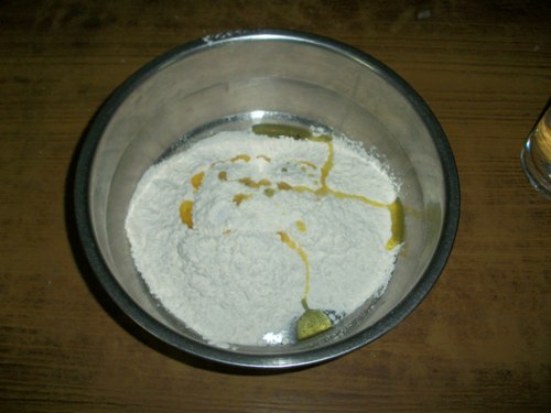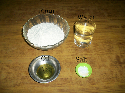 - Take flour, salt and oil in a mixing bowl and rub well. Slowly add in water and make into a firm dough. Knead it for 5 mins. Apply some oil on top and cover it with a bowl and let it rest for 30 mins.