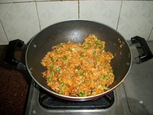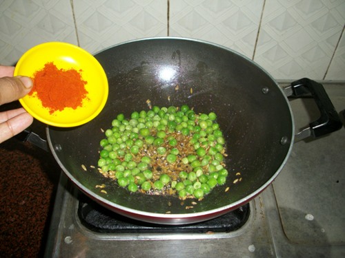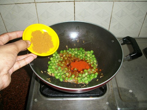 - Add in peas and mix well. Now add in chilli powder, coriander powder and mix well.