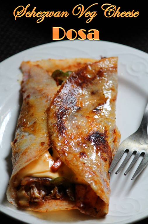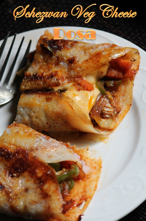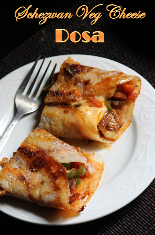 - Heat a tawa, make dosa thinly, now dollop a teaspoon of butter and little schezwan sauce. Spread it evenly. Now top with veggies and cheese. Fold and serve.