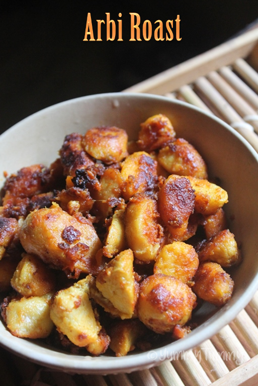 roast; Arbi roast or Arbi fry - Taro roots tossed in indian spices and fried to golden in a cast iron pan.
