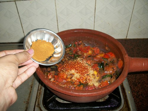 - Add chilli, coriander, turmeric and garam masala powders in and mix well.