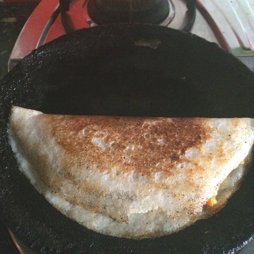 - Now to make dosa, spread dosa batter thinly, drizzle oil all around the dosa and cook it till golden Spoon potato filling over it, let it crisp up, fold and serve.