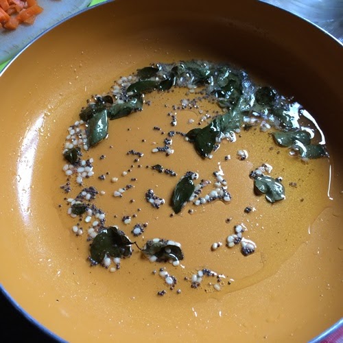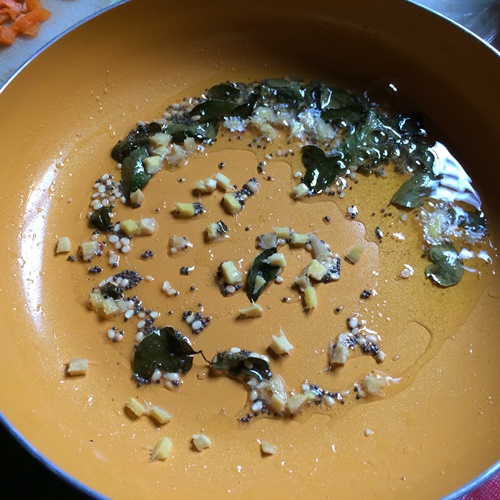 - Heat oil in a pan, add in mustard, urad dal, asafoetida and curry leaves. Let them sizzle.