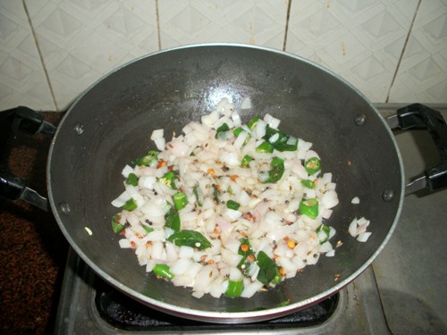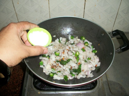 - Now add in onions and green chillies. Season with salt. Cook this for 3 mins.