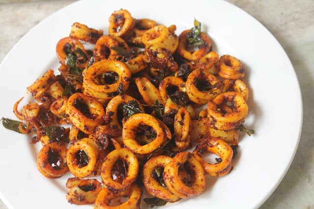 Squid fry recipe, also known as Kanava roast, kanava fry or koonthal fry is a popular recipe from Kerala. Tender Squid rings are roasted with spices, ginger and garlic in coconut oil to create this fried masala coated squid.