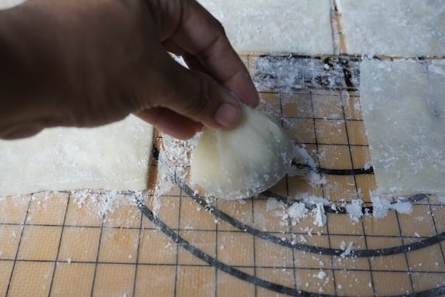24)Place the bean over the sticky rice square. Brush sides with water.