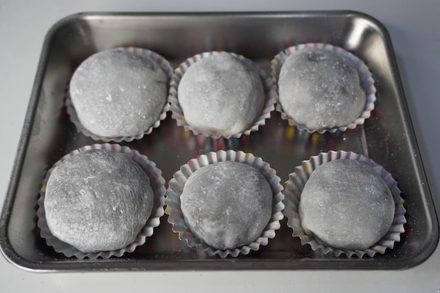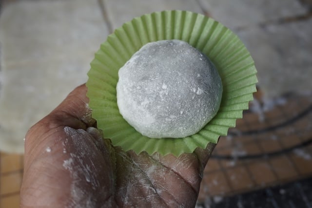 - Now place a ball on the mochi squares and brush water on the sides. Bring the sides together to seal it . Cut off excess dough if there is any. Place on a cupcake liner and place in fridge.