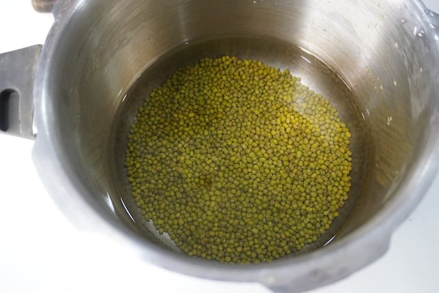Take green gram in a pressure cooker. Cover with water and pressure cook for 4 to 5 whistle until the beans is soft and cooked.
