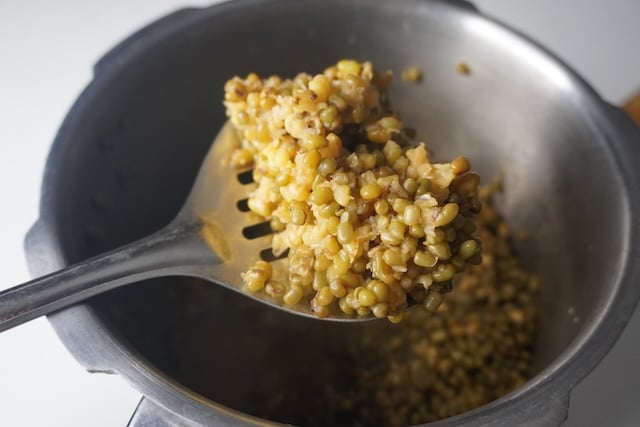 - Make Filling - Take green gram in a pressure cooker. Add in water and cook for 4 whistle. Let the steam escape, now the beans must be cooked. Strain the beans in a sieve. Reserve the cooking liquid.