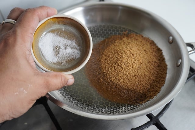 4)Add in brown sugar and a pinch of salt. Mix this really well and let it come to a full boil and allow the brown sugar to melt completely.