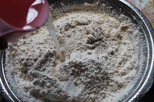 - Add in water slowly and knead to a soft smooth dough. Cover the dough with a bowl and set aside for 30 mins.