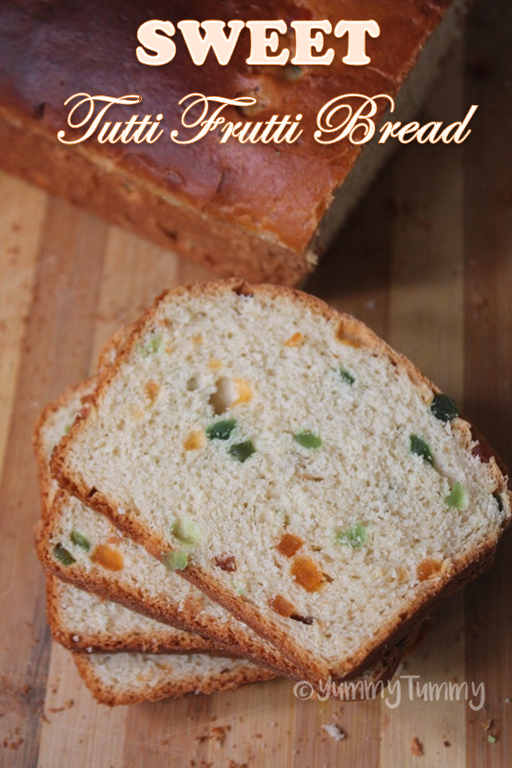 Tutti Frutti Bread which has soft buttery milk bread dotted with tutti fruity all over it. The fruit bread is baked to perfection and a slice is perfect with a cup of milk.