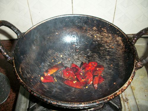 - Now fry dry chillies in the kadai till golden.Remove and set aside.
