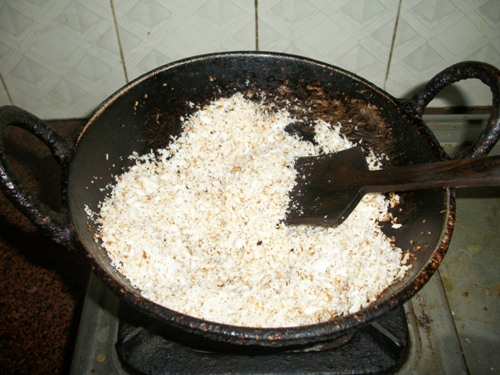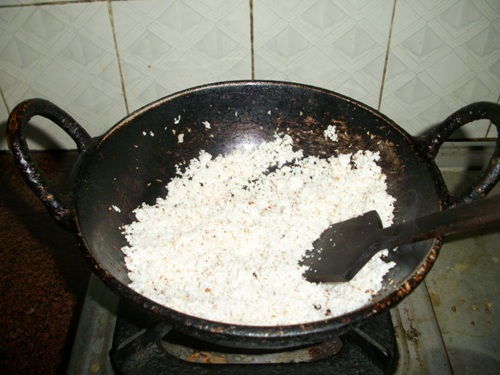 - Now add 1 teaspoon of oil and add in coconut and fry till it turns dark golden..Remove this and put it in a separate bowl.