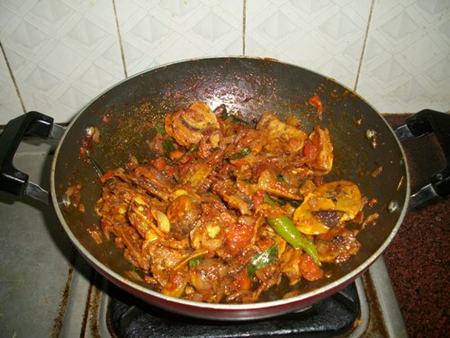 - Throw in the cooked brinjal pieces and mix well in the masala.