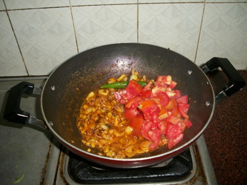 - Throw in tomatoes and cook for 3-4 mins until the tomatoes turn mushy. Add in curry leaves and toss well.