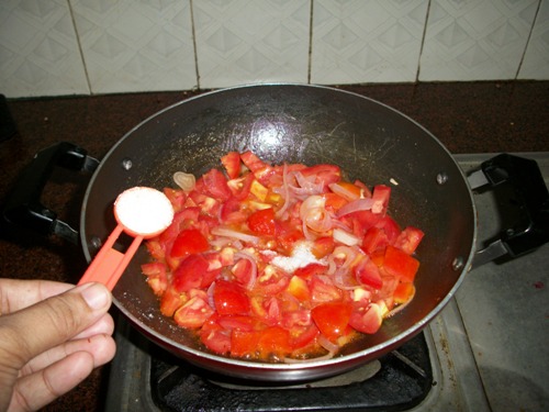 - Now add in tomatoes and mix well. Cook this for 5 mins covered until the tomatoes turn mushy.