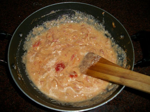 - Switch off the flame and let this cool a bit. Add curd and mix well.