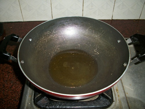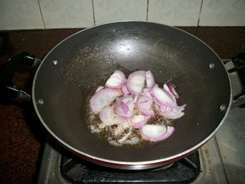 - Heat oil in a kadai and add in onions, fry this for 1 min.