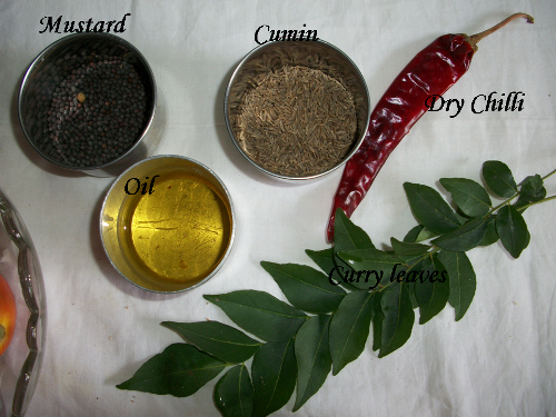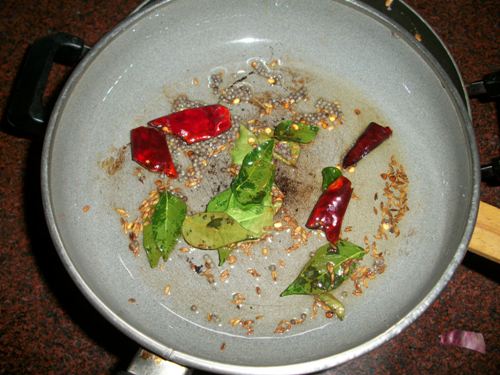 - Now make seasoning. Heat oil and crackling mustard, cumin, red chilli and curry leaves.