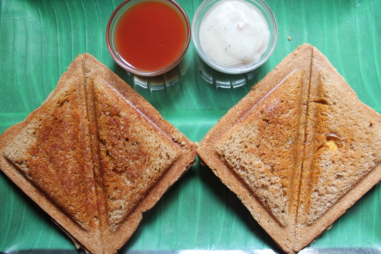 - Take a bread slice, spoon some filling in, sandwich with other bread and toast it in a toaster or grill pan or a tawa.