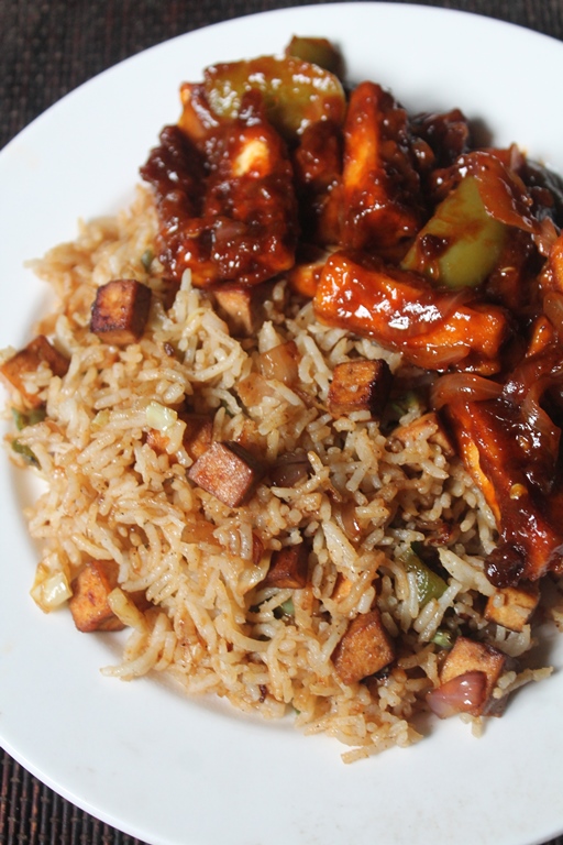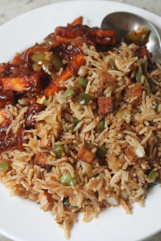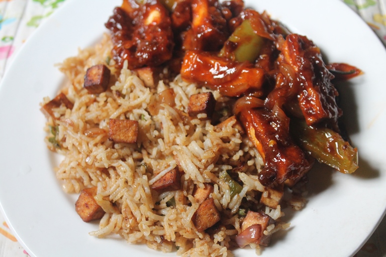 This is one quick fried rice you can make with tofu. I marinated the tofu before and sauted it till golden, then i tossed it with the rice, this way the tofu is not bland and has some flavour to it. You can serve it as it is or as a side for any gravy.