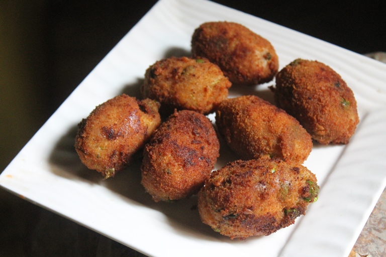 - Dip balls in this and roll it in breadcrumbs. Put this in fridge for 30 mins or so.