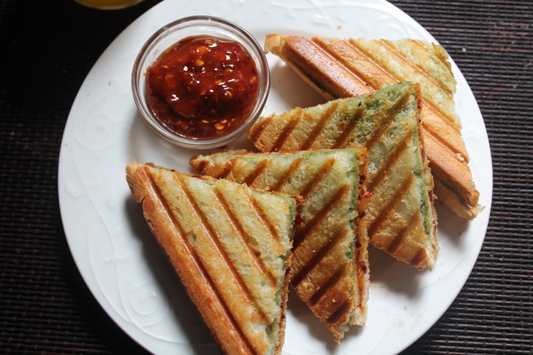 This is one hell of a sandwich, my favourite. Even looking at them make me drool, it is so good. Not only it is pretty to look at but it packs tons of flavours as well. Both the chutney along with the generous amount of butter never goes wrong..
