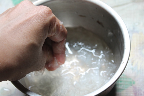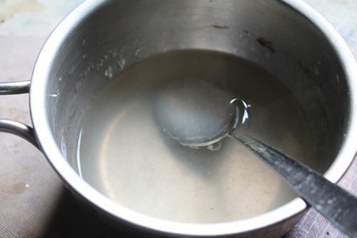 - Break agar agar in a sauce pan, add in water and mix well using your hands. Set aside for 10 mins.