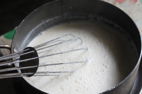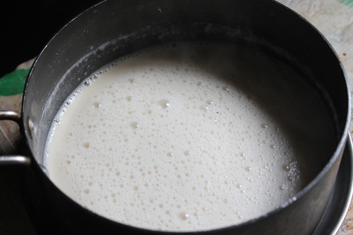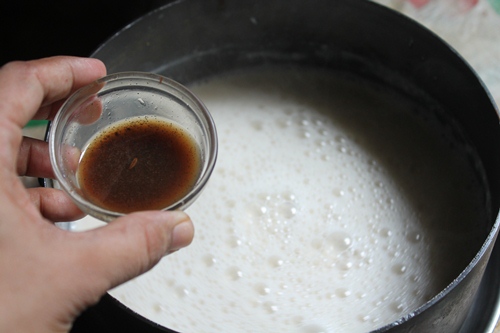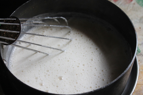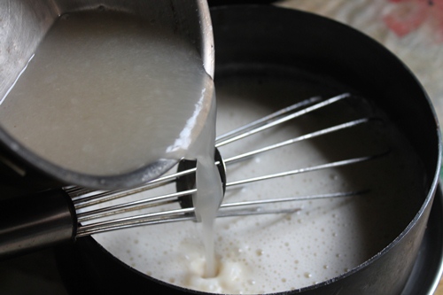 - Pour this china grass mix into the milk and heat it gently so the mix gets hot and whisk well.