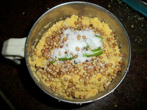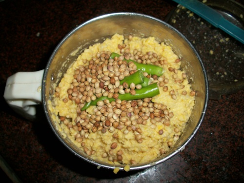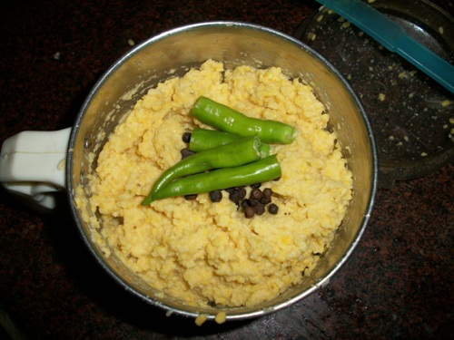 - Grind it till it is half done. Now add green chillies, coriander seeds, pepper and salt and grind into a slight coarse paste. Transfer into a bowl.