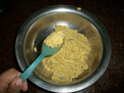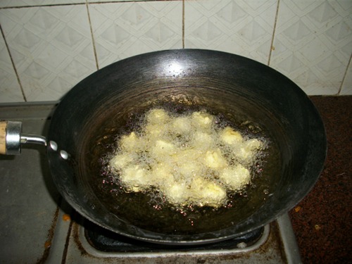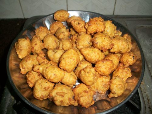- Heat oil for deep frying and drop a spoonful this mixture in oil and fry till golden.
