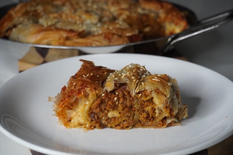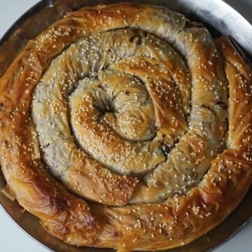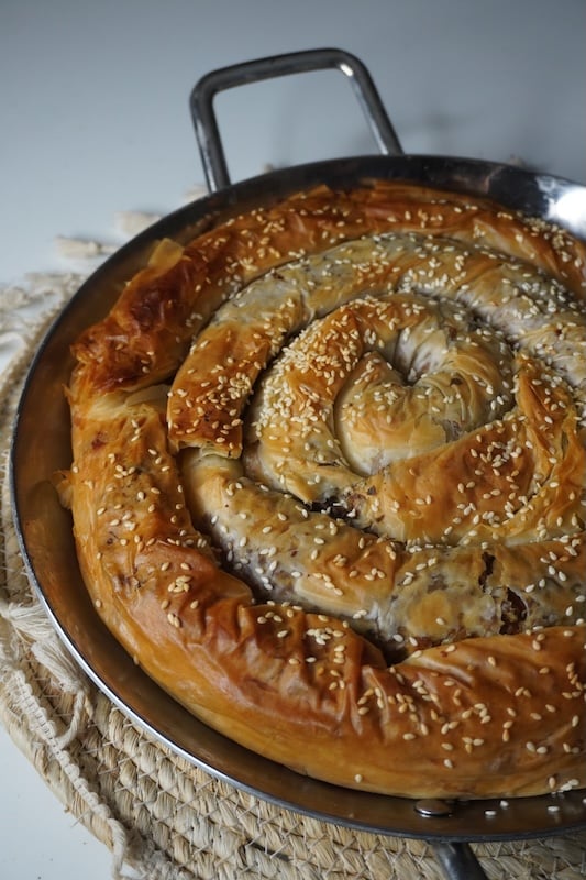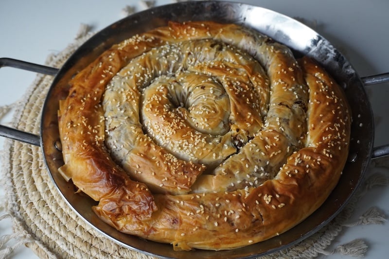 Borek is a flaky pastry popular in Mediterranean cuisine, especially in Turkey and the Balkans. Traditionally it is made with phyllo sheets or yufka dough and comes with various fillings like spinach, cheese, potato or minced meat.