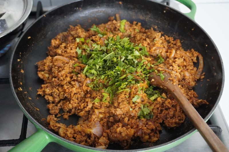 - Now add in all spice powders, salt, pepper, tomato sauce and water. Mix well. Cook for 2 more mins. Now add in cilantro and mix well. Soya filling is ready. Set aside to cool.