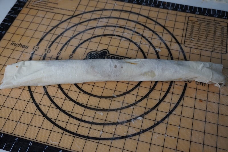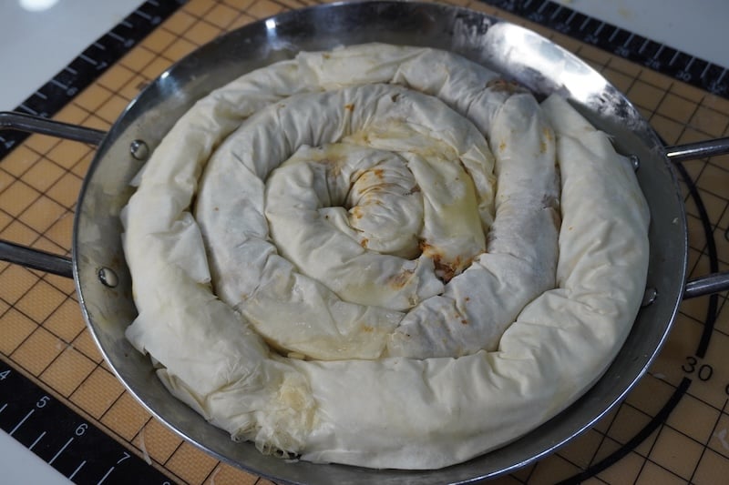 - Take 2 sheets of phyllo and brush it with oil generously. Now spread the filling on it evenly. Start rolling from one side tightly like a log. Now place this over the greased pan and Coil into a spiral. Prepare second log exactly like the first one. Join a second log to the first by stuffing the ends inside each other. Continue forming the spiral. Log sides should be in contact but not tightly squished.