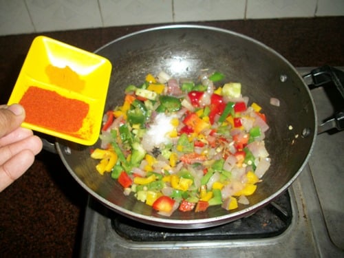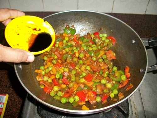 - Add in turmeric, chilli, garam masala powder and mix that with the vegetables. Add in ketchup, soy sauce and toss well. Pour a splash of water if the mix is too dry.