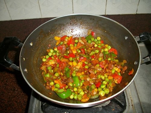 This vegetable kothu parotta uses simple ingredients like onion, capsicum, peas and basic spices.