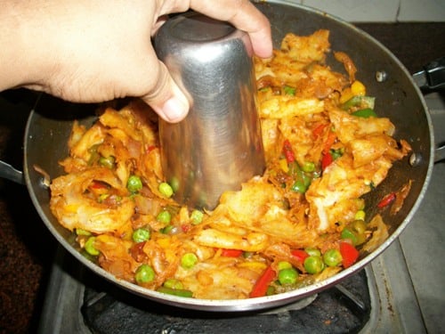 - Now add in the shredded parotta and mix with the vegetables. Once everything is mixed, take a sharp edge steel cup and press it against the parota to make them smaller and this process is actually the kothu. Now add in 1 tablespoon of oil and roast the parotta for 2 to 4 minutes.