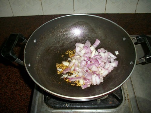 1)Heat oil in a pan. Add in fennel seeds and allow them to splatter and flavour the oil. Add in chopped onions, green chillies and ginger garlic paste and saute for 1 minute.
