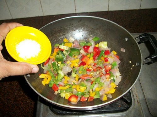 2)Add in your favorite veggies of choice. You can use carrots, beans, cabbage. Sprinkle salt over the vegetables. Saute the veggies for 3 to 5 minutes until is tender and cooked. Cook covered.