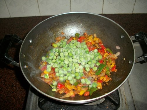 5)Add in green peas. Cook that for 2 to 3 minutes until the green peas soften.