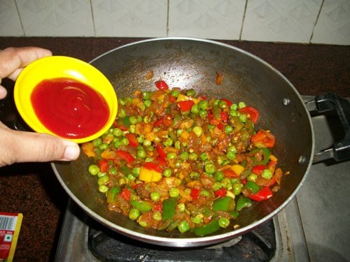 6)Now add in tomato ketchup. Instead of this you can add chopped tomatoes.