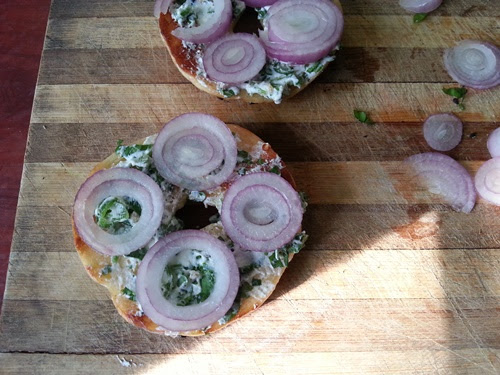 | smear the herby spread all over the bagel |