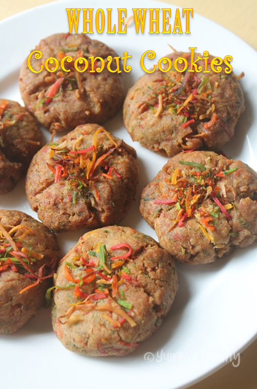 Whole Wheat Coconut Cookies Recipe with Step by Step Pictures. Eggless cookies made with desiccated coconut and no butter. Try it and you will love it just like my eggless oats cookies & egg free honey walnut cookies.